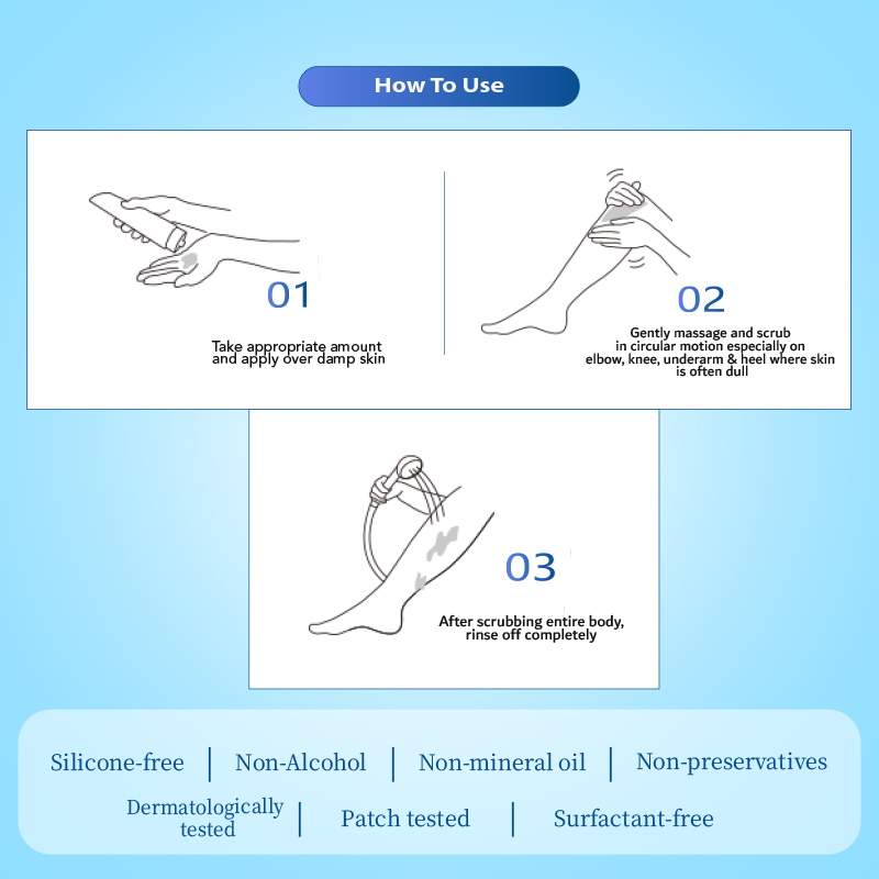 Apply to damp skin and gently massage in circular motions—focus on rough areas like elbows, knees, and heels. Rinse thoroughly. Use 1–2 times weekly. Follow with a moisturizer for best results.